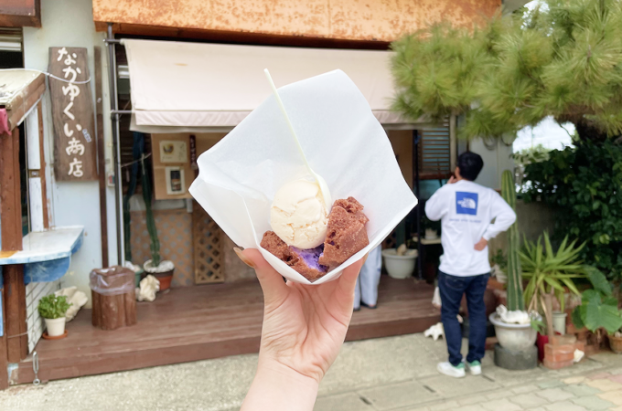 伊良部島で人気を誇るスイーツスポット、「なかゆくい商店」。 看板メニューは、揚げたてのサーターアンダギー。外はサクッとしていて、中...